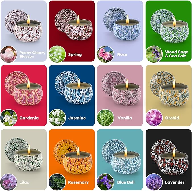 - Various Scented Candles Available: Contains 12 Scents: Rose Bluebell, Lavender, Orchid, Spring, Jasmine, Peony Cherry Blossom, Gardenia, Wood Sage& Sea Salt, Lilac, Rosemary, Vanilla, Whether you're looking for something bold and masculine or soft and comforting, there's a fragrance waiting to be discovered