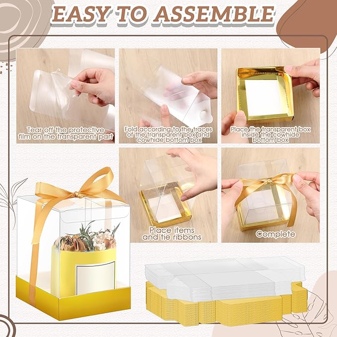 Cunno 36 Set 3. 5 x 3. 5 x 4. 3 in Transparent Candle Gift Box Packaging Box 4-18 oz Handmade Tealight Candle Holders Bulk Paper Bottom Cover with Ribbon for Wedding Baby Shower Party(Gold)