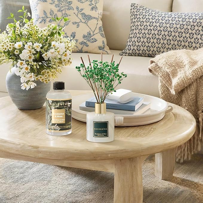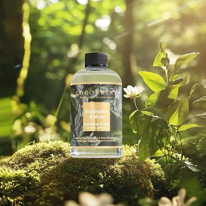 Cocorrína Reed Diffuser Refill Eucalyptus & Moss 17oz (500ml) with 8 Rattan Sticks - Premium Long-Lasting Essential Oil, Home Fragrance for Bedroom, Bathroom Home Decor