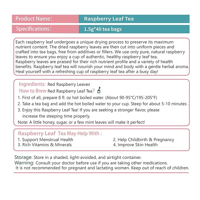 - 【Easy Brewing Instructions】: Brew each raspberry leaf tea bag with 300-400ml of 195-205°F (90-95°C) water for 5-10 minutes. Convenient and portable, enjoy a rich, distinctive, and aromatic herbal tea experience anytime, anywhere