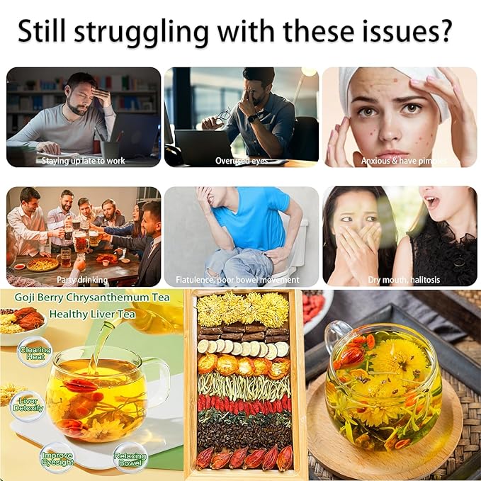 - 【Pure Natural Herbs】8 kinds of carefully selected herbs: Goji berries, chrysanthemum, dandelion, cassia seeds, orange peel, mulberry leaf, gardenia and honeysuckle. Scientific proportioning, natural drying, without any additives, safe and natural. Shelf life of 12 months.