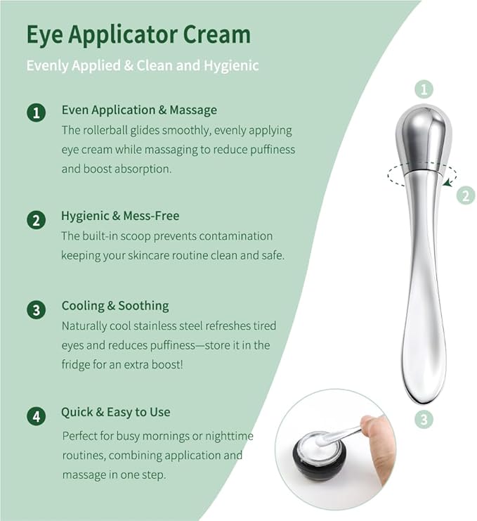 - Eye Cream Applicator: This rotating applicator rolls on the eye area, aiding cream absorption, reducing puffiness and fatigue. The tail for scooping avoids direct contact, ensuring a cleaner use.