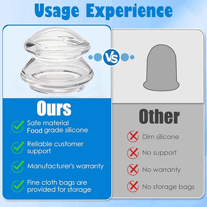 - Include 7pcs Massage Silicone Cups:Large Cups-2pcs, Medium Cups-2pcs, Small Cups-3pcs, A delicate flannel bag, Easy to store those cups.