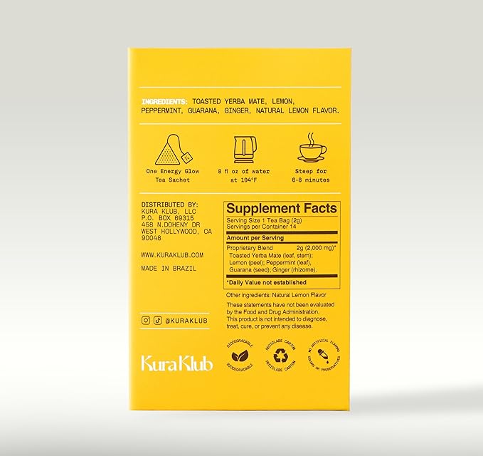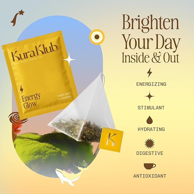 Kura Klub Yerba Mate Energy Glow Tea – Premium Energy Herbal Tea with Guarana, Ginger & Peppermint for Digestion, Gut Health & Satiety – Jitter-Free, No Crash – 3-in-1 Wellness Blend – Caffeine Alternative, No Microplastics – 14 Premium Teabags