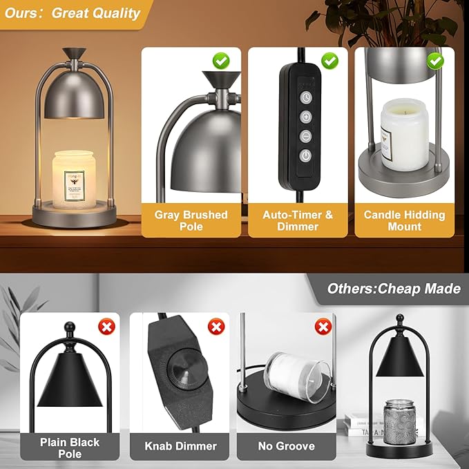- Dimmable Candle Warmer Lamp with Timer:Due to the thermal conductivity of metal, the lampshade will continue to generate heat while helping the candle to burn fully. For longer life and better ambiance, we recommend using medium-high brightness for small candles and low brightness for large candles.Black Candle Warmer Lamp comes with 2H/4H/8H timer function, you no longer need to worry about forgetting to blow out the candle when you go out!