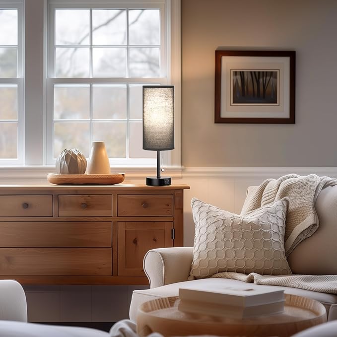 Black Bedside Lamps for Bedroom Set of 2 - Nightstand Table Lamp with USB Charging Port, Pull Chain Night Stand Light, Side Table Desk Reading Lamp for Living Room/Dorm/Bathroom/Kitchen