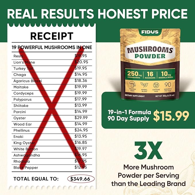 - 16 MUSHROOM COMPLEX: Fidus Mushroom Powder includes 16 mushrooms—7 adaptogenic and 9 functional types. Each serving provides 17,300mg of raw mushroom equivalent. With 90 servings per pouch, enjoy a full 3-month supply. Featuring Lion’s Mane, Cordyceps, Turkey Tail, Shiitake, Reishi, Chaga, and more, it’s a powerful boost to your daily wellness routine