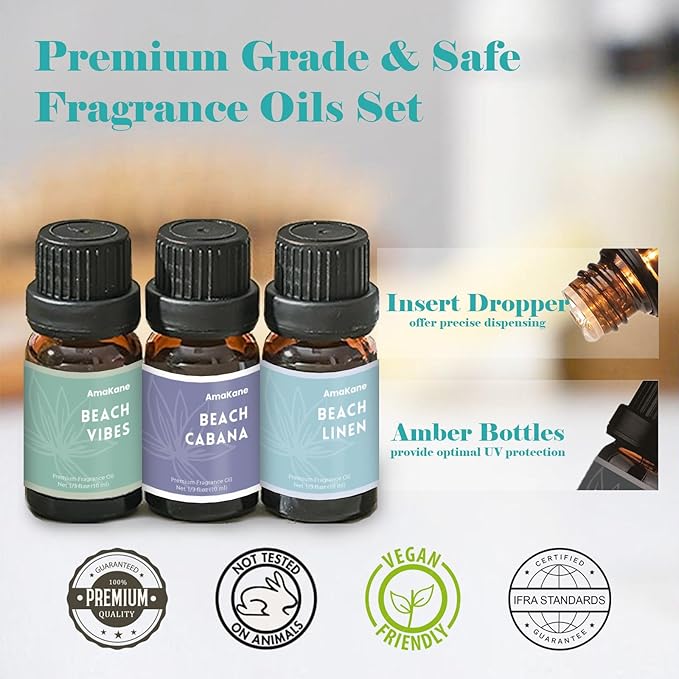AmaKane Fragrance Oils, Beach Fragrance Oil for Candle Making, Soap Making Scents, Summer Essential Oils for Diffusers for Home 6x10 ml, Beach Linen, Salty Sea, Sunset Glow and More