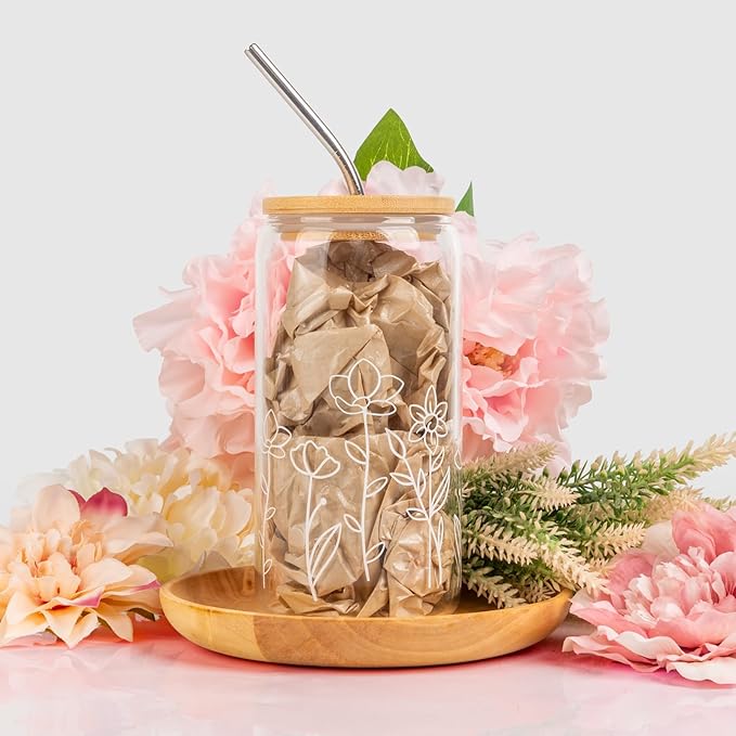 - FLORAL DESIGN ICED COFFEE CUP: Brighten your lady's day with our glass cup featuring a line floral print, perfect for those who cherish a splash of joy and nature in their everyday routine. This tumbler is crafted from high borosilicate glass(Dishwasher safety design), which withstands rapid temperature shifts. It features a natural bamboo lid that enhances the drinking experience.