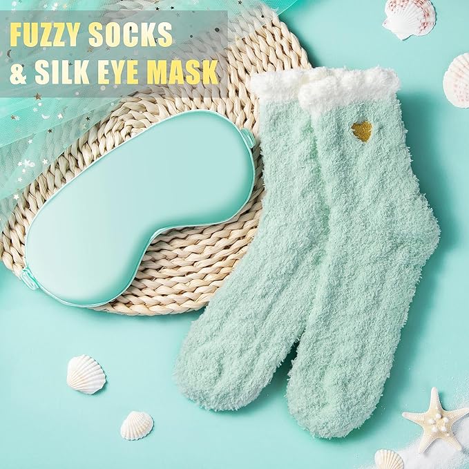 - Keeps you Warm All Seasons: A thick fleece blanket (40"W x 60" L) features premium skin-friendly plush flannel that is super cozy and fluffy. Wrap your lady in warmth and comfort with this throw blanket while providing a sense of security, while the furry socks keep her feet cozy and warm. The silk eye mask masks naturally relieve your tension and improve your mood through a peaceful full night's sleep, while keeping your eyes relaxed