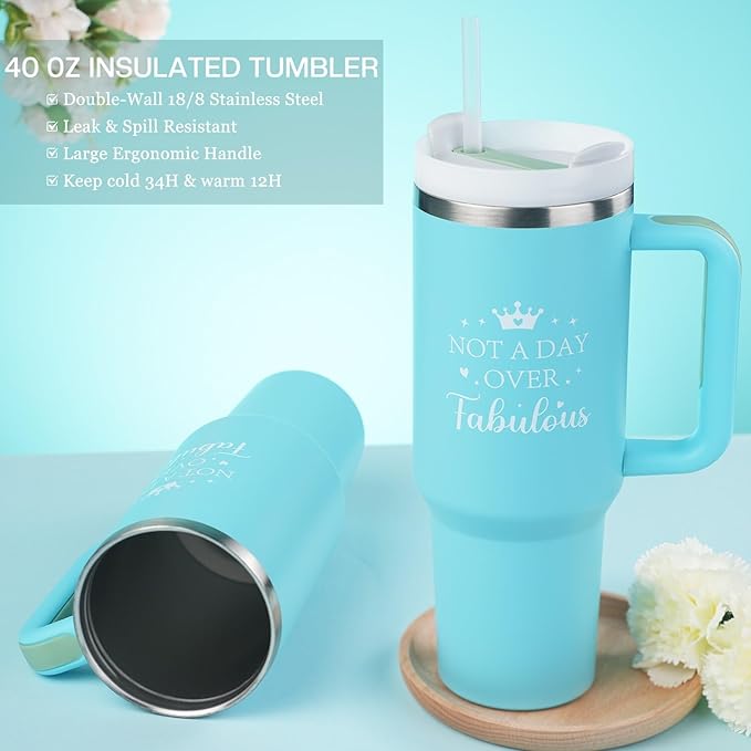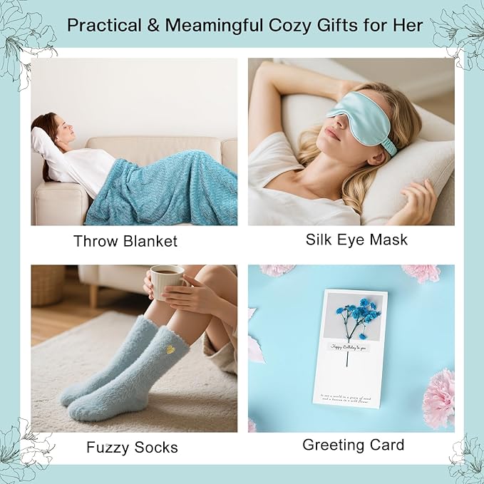 - Everyday Thoughtful Companions, Birthday Wishes That Last: The 40oz blue stainless steel tumbler isn't just a cup - it's a witness to her new age: morning coffee, afternoon iced tea, nighttime warm milk. Its vacuum insulation keeps drinks at perfect temperature, just like your enduring care. The cloud-soft blue blanket wraps her in warmth during movie nights, while the ultra-soft blue socks feel like birthday kisses for her feet. Your handwritten words on the blue dried-flower card become her most cherished keepsake. This thoughtful care package for women extends birthday joy to everyday life