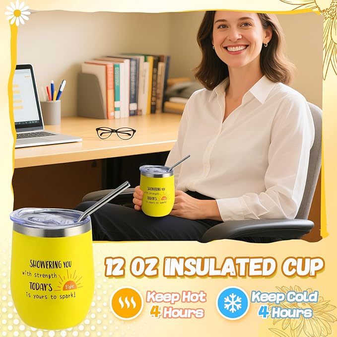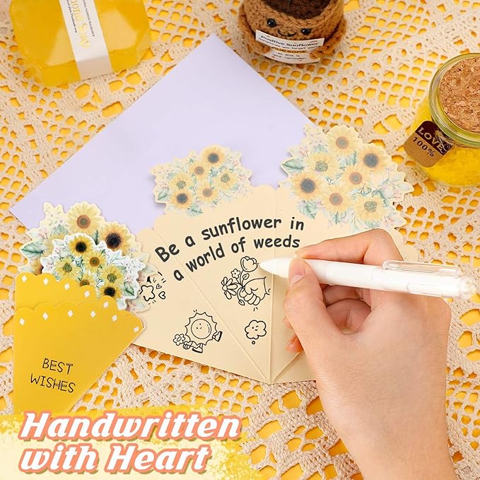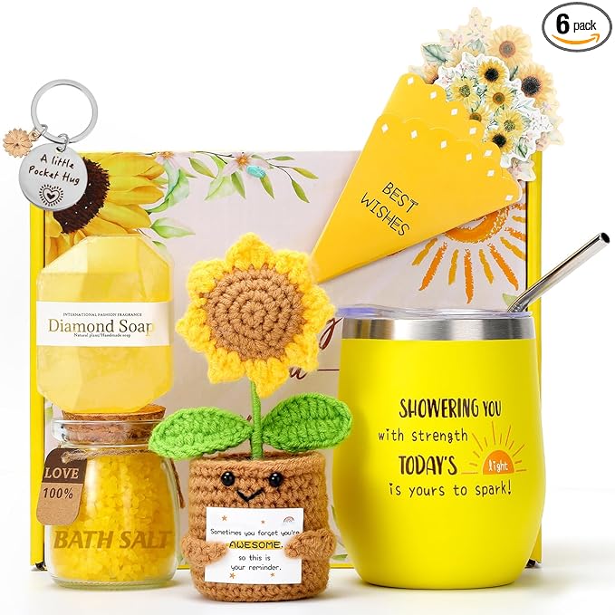 - Uplifting Gift Basket for Women: Our uplifting gift basket wraps women in comfort, featuring: a crocheted sun flower with an encouraging note, an elegant tumbler with inspirational quotes, a sweet “pocket hug” keychain, a sun flower card, bath salts, and a handmade soap - every item chosen to soothe and uplift.