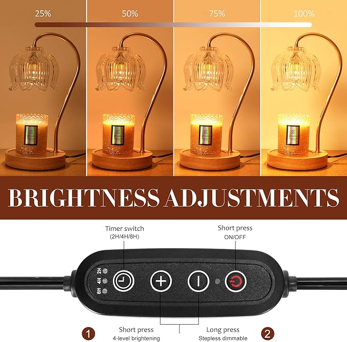 - 【Adjustable Brightness & Temperature】Featuring four dimmable settings, allowing for precise adjustment of the wax melting speed.Adjusting to a higher brightness setting accelerates the release of fragrances. Package includes two 50W bulbs.(Candles not included.)