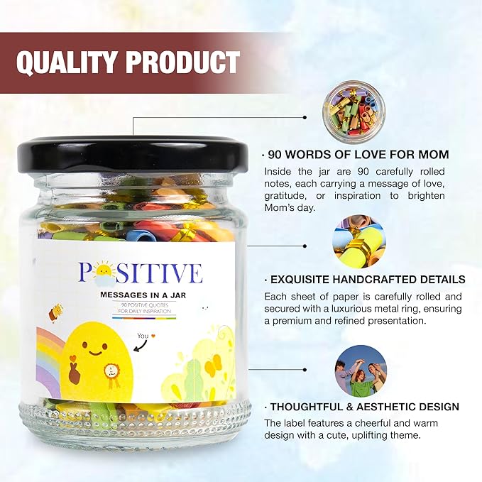 - π Positive Jar: 90 Uplifting Messages to Brighten Every Day Inside this cheerful jar are 90 colorful scrolls, each with a positive affirmation designed to uplift your spirit, spark hope, and encourage mindfulness. Itβs like a pocket-sized therapist β just pick one when you need a boost.
