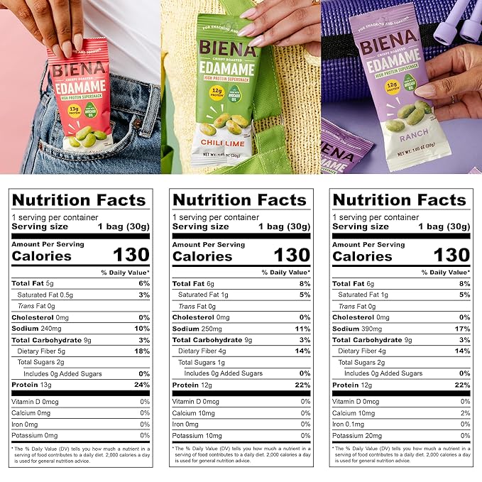 - TRIO OF BOLD FLAVORS – Enjoy a variety of delicious, crispy edamame snacks with three standout flavors: Himalayan Pink Salt for a salty crunch, Chili Lime for a bold, spicy kick, and Ranch for a zesty flavorful explosion. Each flavor packs 12g to 13g of protein and 4-5g fiber per serving, making this variety pack a nutritious and satisfying choice. Edamame sourced from China, seasoned and packaged in the USA