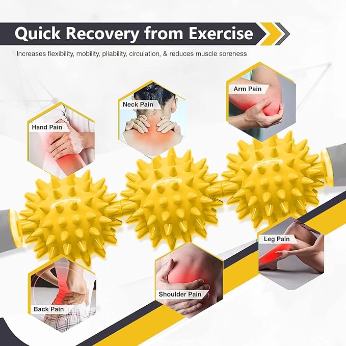 - ā 3 MASSAGE BALLS FOR BODY RELAX: Spike nodules balls provide deep tissue massage with acupoints stimulation to promote blood circulation and help reduce muscle pain, soreness, pain and nodules. Used at least once daily for around 5 to 10 minutes per each target skin area, helps loosen muscles before and after workouts to reduce risk of injury