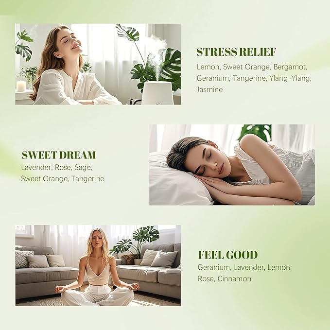 - Top selling essential oils set: Essential oils set of 6x10ml include - Stress Relief, Sweet Dream, Deep Breathe, Pure Zest, Easy Mood, Feel Good, Introduce the long-lasting, pleasant, and relaxing aroma to your home.inclued for your well-being and happy life.