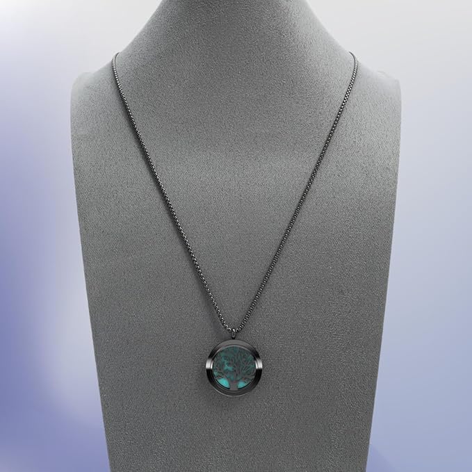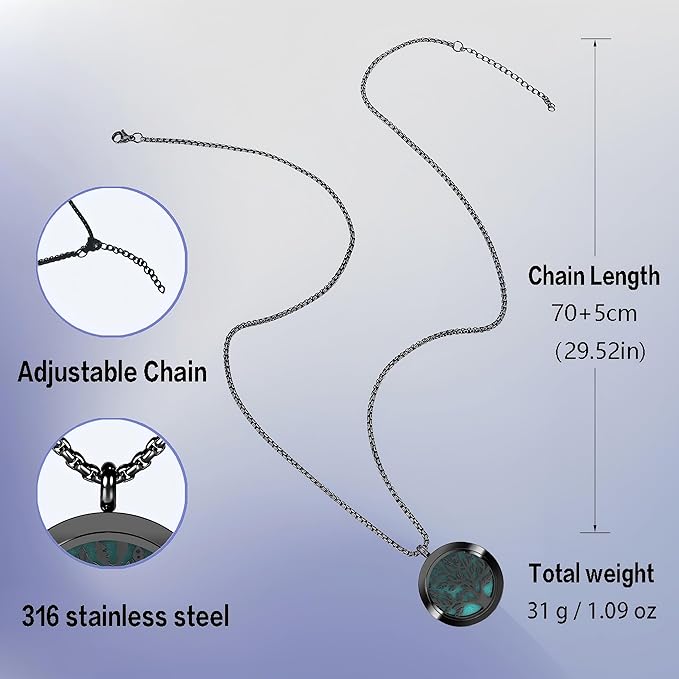 - Aromatherapy Diffuser Necklace - All day comfort essential oil jewelry with premium anti-allergy design; This pendant is crafted from high quality 316L stainless steel with black gold plating, naturally tarnish-resistant, nickel-free and gentle on sensitive skin. Elegant tree of life design adds spirituality, perfect for everyday wear, gift giving or special occasions:Overall chain length: 27.56 inches (70 +5 cm), adjustable length, fits most necklines