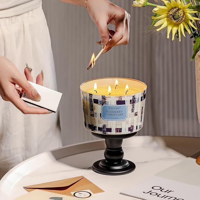- 【Blueberry Cheesecake Fragrance for Relaxation】4-Wick Candles capture the essence of Blueberry Cheesecake with its fruity, tangy top notes, a heart of creamy cheesecake, and a sweet, indulgent base of vanilla and graham cracker. perfect for cultivating a serene ambiance in living rooms, bedrooms, or bathrooms.