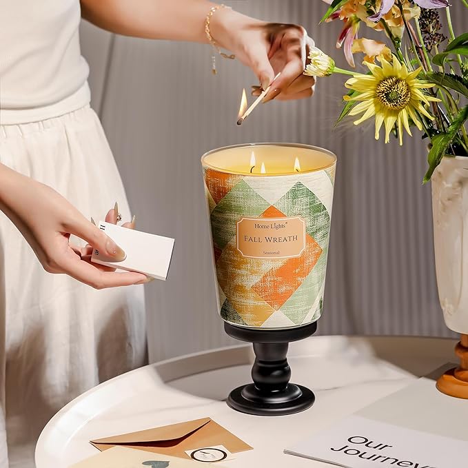 - 【Fall Wreath Fragrance for Relaxation】Scented candles capture the essence of Fall Wreath with its crisp, earthy top notes, a heart of warm spices, and a base of aromatic pine and autumn leaves. Perfect for cozy spaces like living rooms, bedrooms, or bathrooms to unwind and relax.