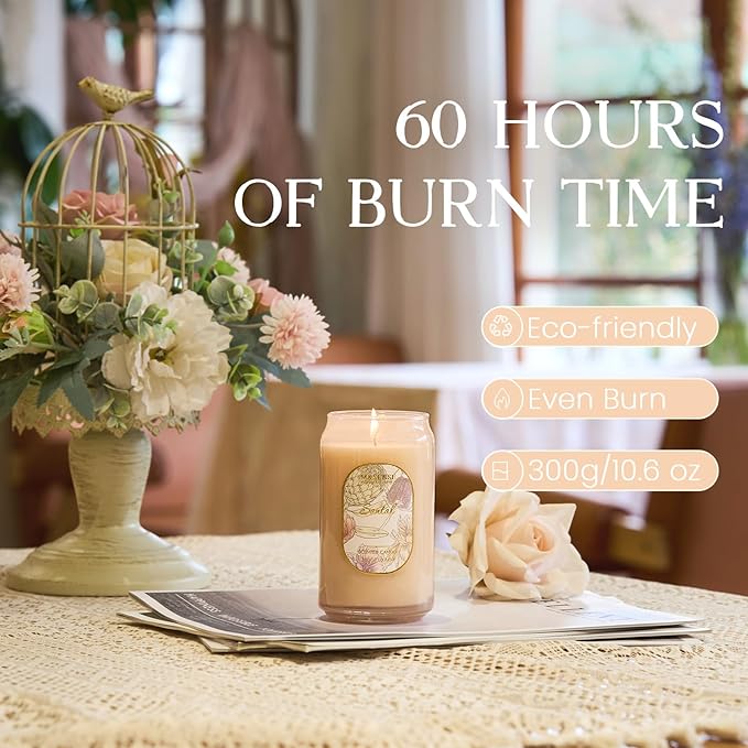 - 【Long Burning Candles】:Infused with premium essential oils, our 10.6-ounce candle promises an elevated fragrance journey. Equipped with a lead-free HTP cotton wick, it delivers an even, smokeless burn, preserving the purity.These Scented candles are designed to burn for 60 hours when properly cared for. Best for 10-15㎡ cozy spaces