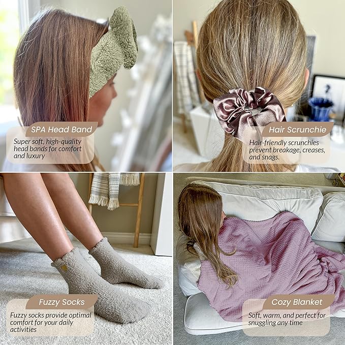 - Surround Yourself In Comfort: The self care gift set for women comes with a 50" x 70" knitted fleece blanket along with fuzzy socks and hair scrungie to offer fuzzy warmth and comfort throughout the year while being easy to clean and maintain for day-to-day use