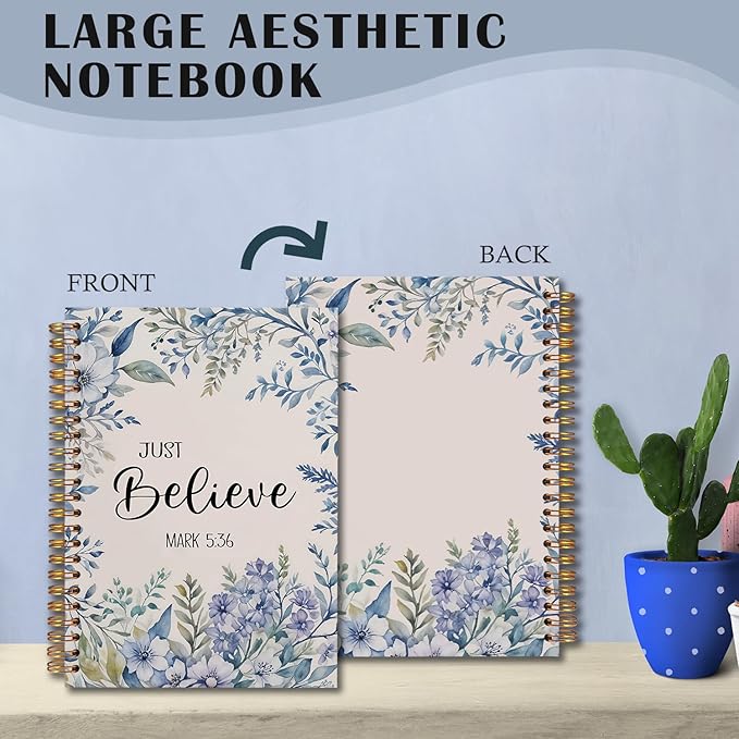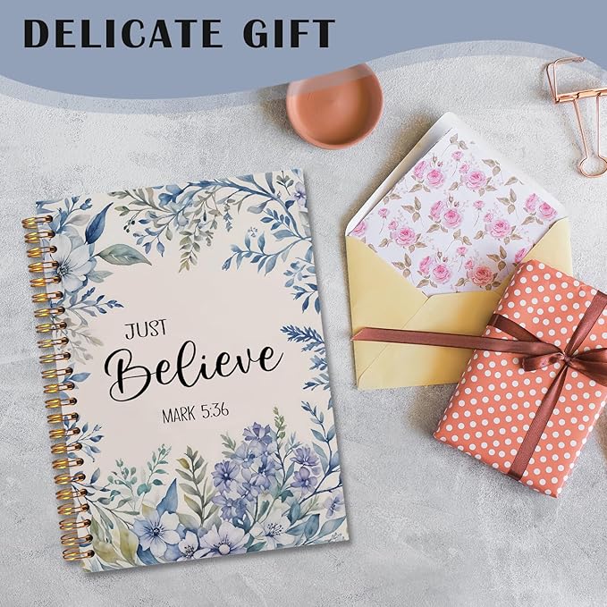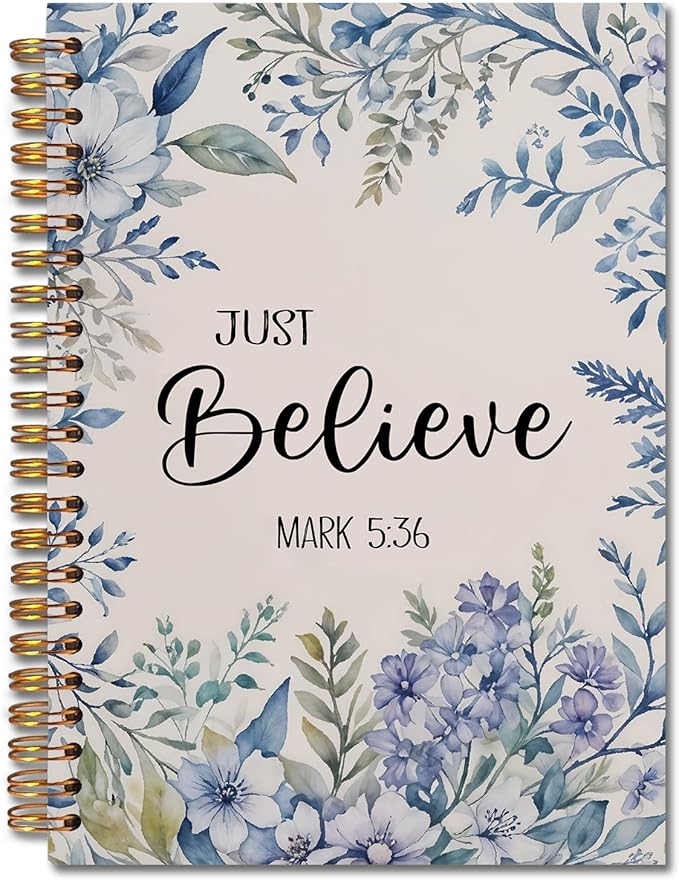 Floral Christian Spiral Notebooks, Just Believe Mark 5:36 Bible Journal, Scripture Journals for Writing, Christian Gifts for Women, Religious Notebook for Note Taking, 5.5x8.3 Inch