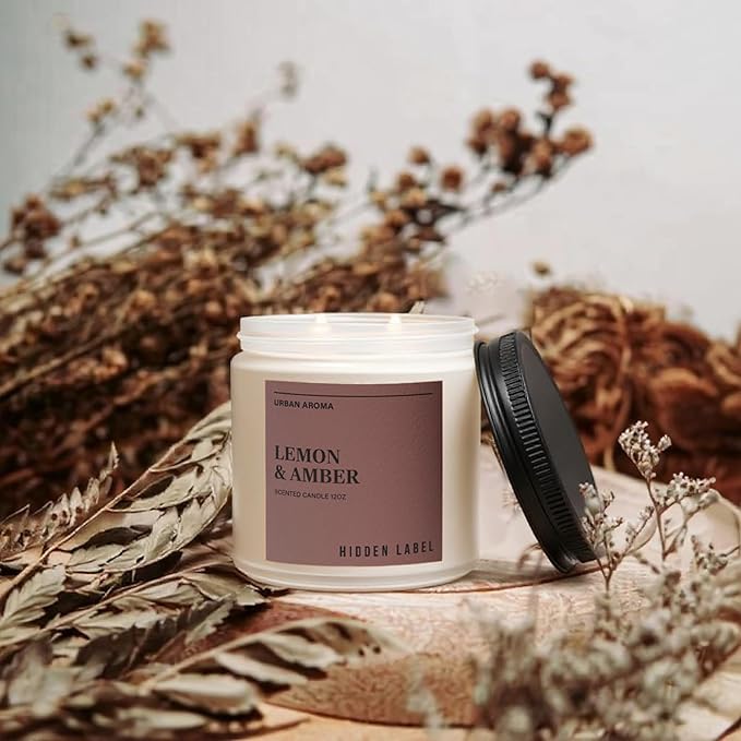 Hidden Label Lemon Amber Scented Candle, 12oz 2 Wick Natural Soy Non Toxic Candles, Clean Burning Long Lasting Aromatherapy for Home | Gifts | Décor,Premium Scents for Relaxation & Stress Relief