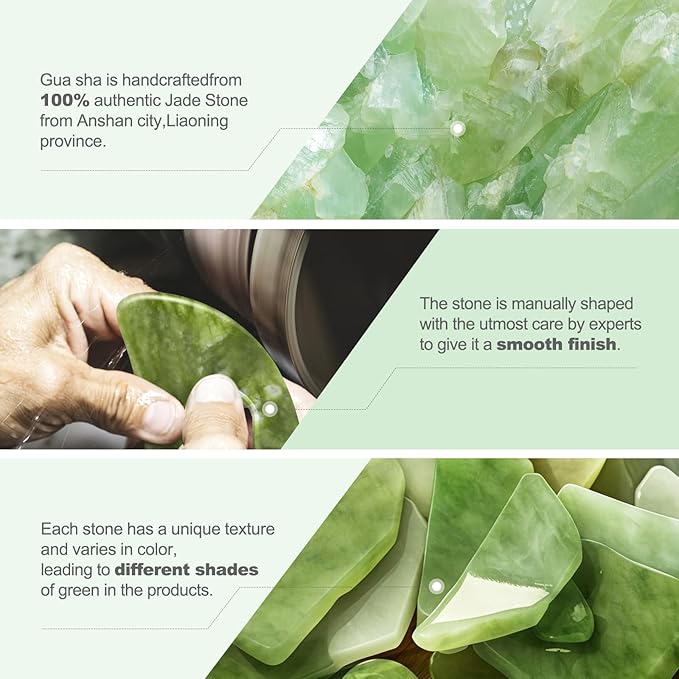 - 【Premium Authentic Jade】The facial gua sha tool is handcrafted from 100% authentic Jade Gua Sha Stone from Anshan city, Liaoning province. The jade stone is known for promoting balance and good energy which will have a positive effect on your skin