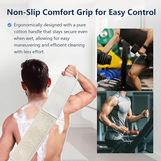 - ERGONOMIC LONG HANDLE & SECURE GRIP DESIGN The extended long handle is engineered for maximum convenience and control. Paired with a non-slip, comfort-grip handle, it ensures secure handling even when wet with soap. This thoughtful design makes the loofah back scrubber easy to maneuver for a effective and satisfying scrub from every angle.