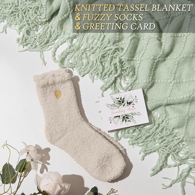 - LUXURY KNITTED TASSEL BLANKET: Ultimate comfort in every thread the oversized knitted tassel blanket is ultra-soft, warm, and stylish - perfect for wrapping up on the couch. Paired with plush coral fleece socks, Just surround her in a love & warmth with this after surgery gifts feel better gifts to express your comfort and support