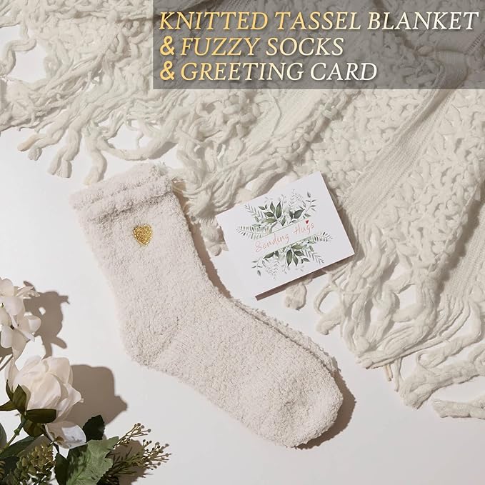 - LUXURY KNITTED TASSEL BLANKET: Ultimate Comfort in Every Thread The oversized knitted tassel blanket is ultra-soft, warm, and stylish — perfect for wrapping up on the couch. Paired with plush coral fleece socks, Just surround her in a love & warmth with this after surgery gifts feel better gifts to express your comfort and support