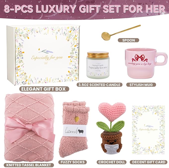 - Intentionally Curated for Emotional Resonance: Every item symbolically chosen: the blanket offers security, the "Hug in a Mug" tumbler provides warmth, and the crochet doll convey personal care during healing journeys.