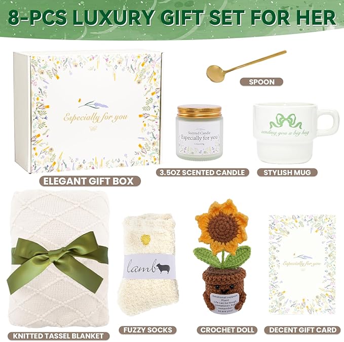 - Intentionally Curated for Emotional Resonance: Every item symbolically chosen: the blanket offers security, the "Hug in a Mug" tumbler provides warmth, and the crochet doll convey personal care during healing journeys.