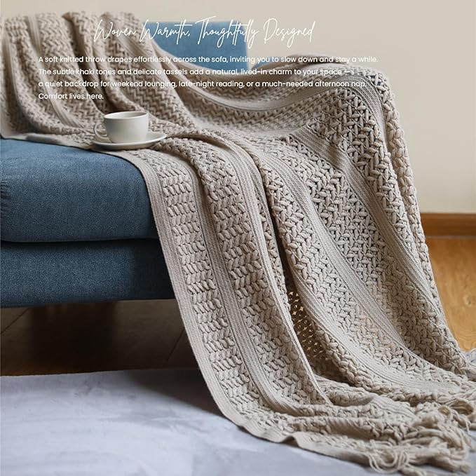 - 3. Cozy Details, Wrapped in Style The knitted throw in khaki, tied with a blush satin ribbon, pairs beautifully with ivory socks and a rustic wooden spoon for a charming, comforting experience.