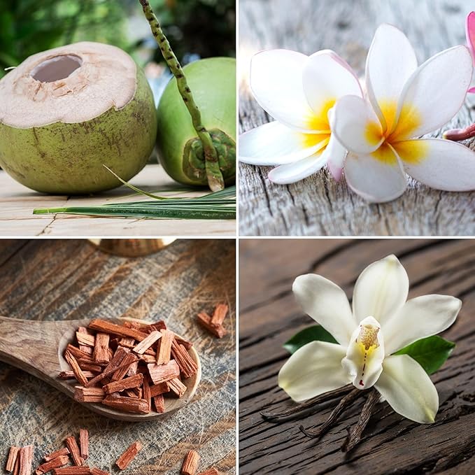 - COCONUT SANDS: Coconut Sands is an exotic blend of refreshing coconut water, beach lily, juicy peach skin, sandalwood, Tiare flower, and apple blossom.