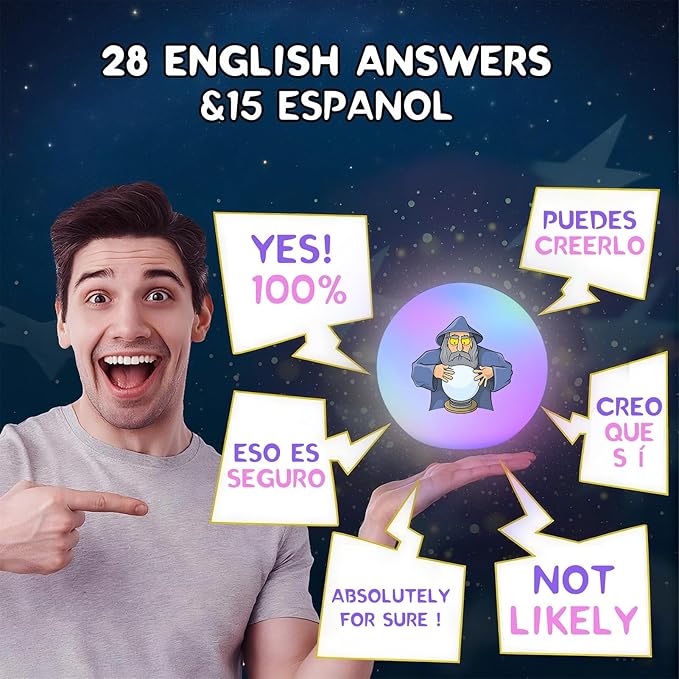 - ►[Fortune Teller Ball]:Silly toys speaker,Ask a YES/NO question and Touch orb's top or Beat table nearby to awaken wizard. It brings much fun for family! 28 English & 16 Espanol Answers.