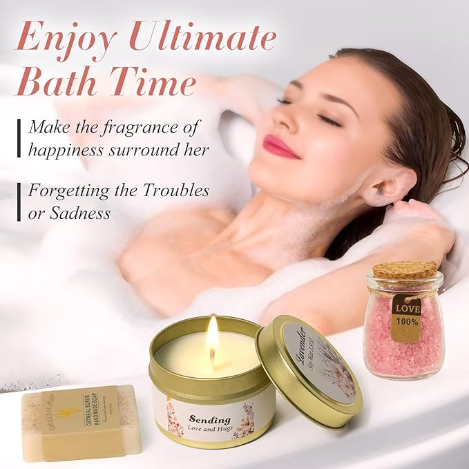 - RELAXING SPA GIFTS BASKET: Made of premium soy wax, the 3.5oz Lavender scented candle in our relaxing spa baskets for women gift can burn smokelessly & evenly for up to 20 hours. Paired with a oatmeal handmade soap and a bottle of bath salt, perfect for gentle cleaning or bath. This relaxation spa baskets for women gift for women is designed to soothe the mind & relax body, and offer her a moment of pure bliss.