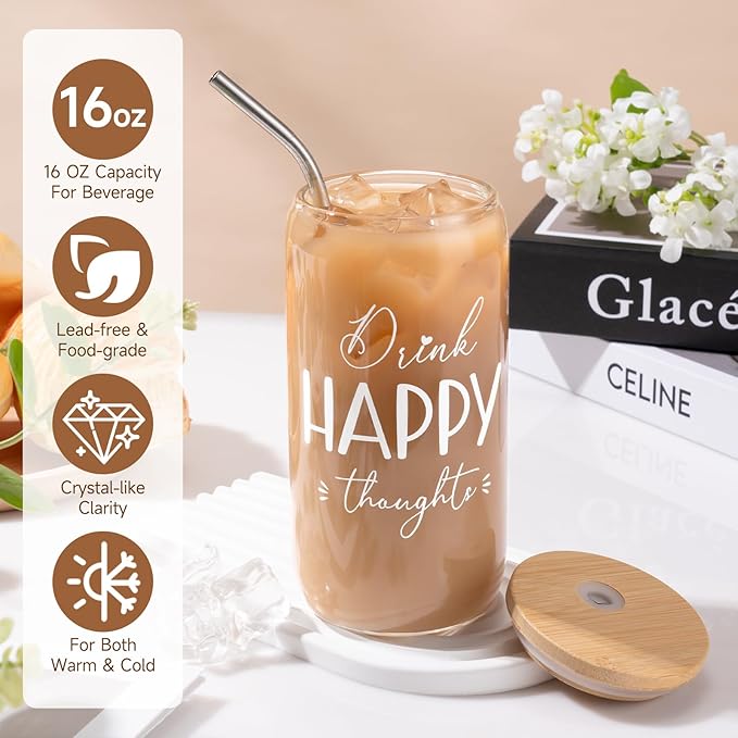 - High-quality Glass Cup: Aside from the Premium Spa Kit, our birthday gifts for women also comes with a 16oz glass bottle, sturdy, lightweight, lead-free & BPA free, suitable for keep cold & warm beverages (≤80 degrees Celsius) for wine, coffee, tea, milk, juice, water etc. The quote "Drink Happy Thoughts" on the glass adds a personal touch, brightening her day and make her smile when she enjoy her beverage, express your love and care, a perfect gift for her