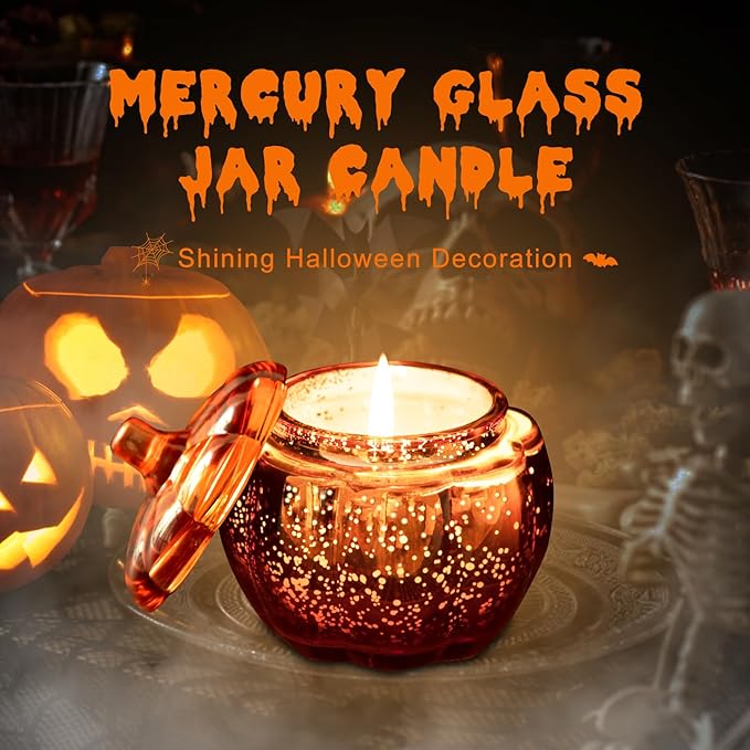 - Elegant Jar Candle Set for Festive Ambiance: Each Halloween candle comes in a pumpkin shaped glass votive holder that diffuses warm, inviting light. Electroplated for a fine sparkle when ignited. The minimalist design fits seamlessly into fall tablescapes, mantels, or centerpieces, adding a touch of seasonal charm to your décor