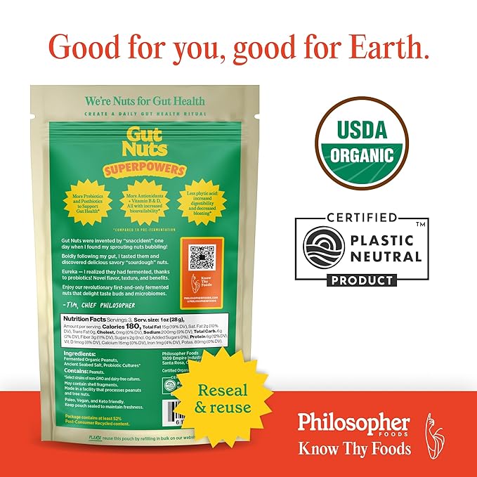 Gut Nuts - Fermented and Sprouted "Sourdough" Peanuts for Gut Health - Tangy, Umami, & Salty Flavors - Super Crunchy Low Carb Keto Snacks - Low Sugar Prebiotic & Postbiotic Peanut Snacks - 3oz Pouch (3 Pack) - by Philosopher Foods
