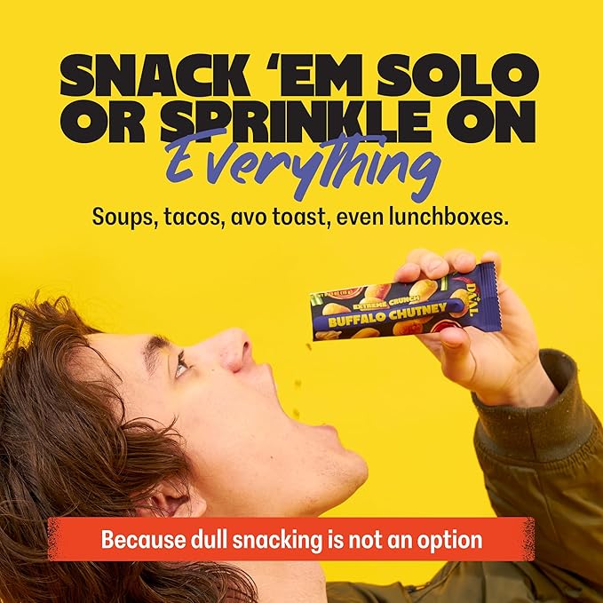 - SPICY-SWEET BUFFALO CHUTNEY FUSION FLAVOR: Bold and unexpected, this East-meets-West snack features crunchy mung beans tossed in a fiery Buffalo-style spice blend with hints of Indian chutney and a touch of brown sugar. It’s smoky, spicy, sweet, and irresistibly satisfying—unlike any snack you’ve tried before.