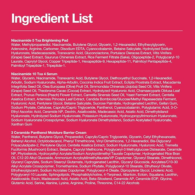 - [3-Step Routine] This routine visibly improves dull, uneven skin tone while smoothing skin texture with gentle daily care. Powered by Niacinamide, TXA, and Ceramides, it helps promote a clearer, more radiant complexion. With continued use, it supports a hydrated, balanced, and healthy-looking skin barrier.