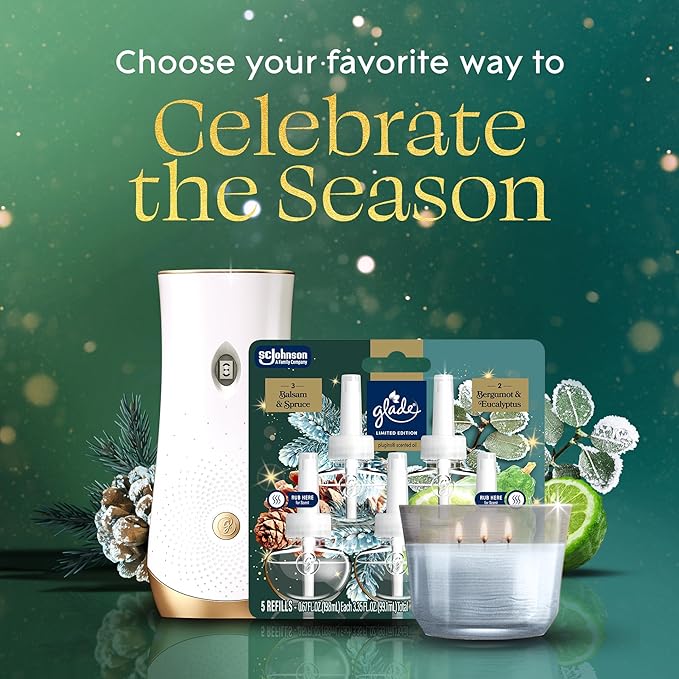 - Also try the Balsam & Spruce and Bergamot & Eucalyptus scents as a Glade air freshener spray, 3-wick candle, or automatic spray