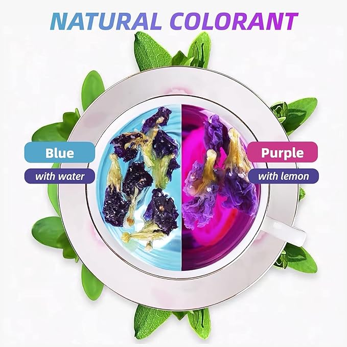 - NATURAL FOOD COLORING: Changes color naturally from blue to purple when mixed with different pH levels of water, perfect for creating vibrant iced teas, cocktails, and desserts.