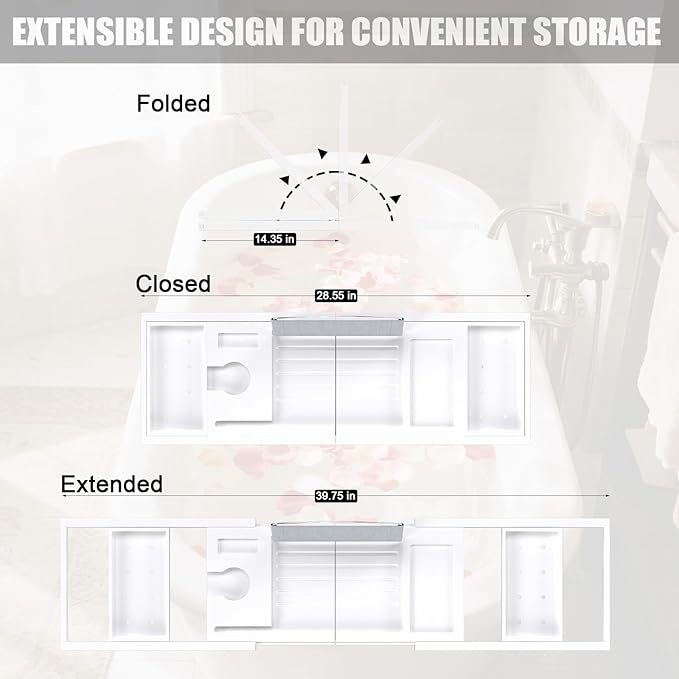 - FITS STANDARD BATHTUB: Our bamboo bath tray for tub was specifically designed to expand from 28.5 inches to 39.7 inches, fits all standard roman bathtub,you just need to manually adjust it to the right length and don't need any tools.
