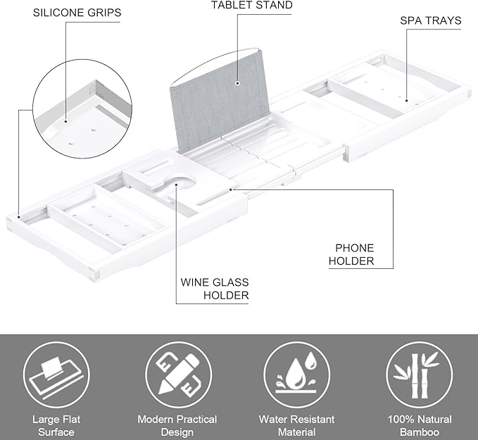 Bathtub Tray Caddy, Expandable Bath Trays for Tub, Bamboo Shelf & Table with Wine Glass Holder,Bathroom Accessories for New Home & Mothers Day & Birthday Gifts for Mom,White