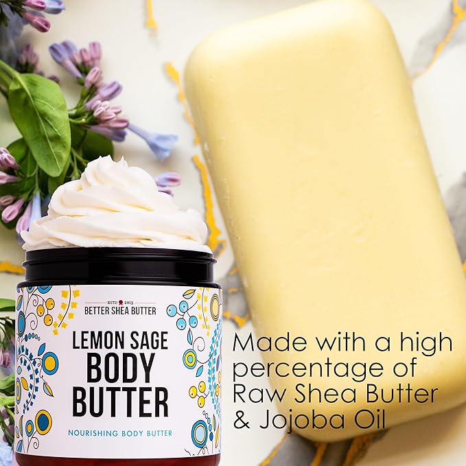 Lemon Sage Body Butter - Whipped Organic Shea Butter with Jojoba Oil and Essential Oils, Natural Lotion for Women and Men, Lemon Scented Moisturizer with No Synthetic Fragrances