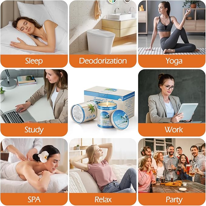 - 【Benefits for Stress Relief & Sleep】 Infused with 8% essential oils, our candles offer aromatherapy benefits to help reduce stress, improve sleep, and enhance focus. The soothing Coconut Beach scent creates a calming environment for meditation, yoga, or bedtime. these candles adding a stylish touch to any space.
