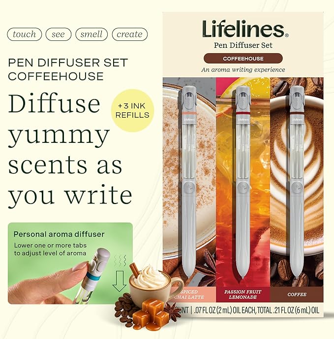 - Lifelines Pen Diffuser Set in Coffeehouse: Immerse yourself in an aroma writing experience with this set of three pens that diffuse the cozy scents of your favorite café drinks as you write. Each pen features a 1.0mm black ballpoint tip and an incredibly comfortable grip. Includes 3 pens and 3 ink refills.